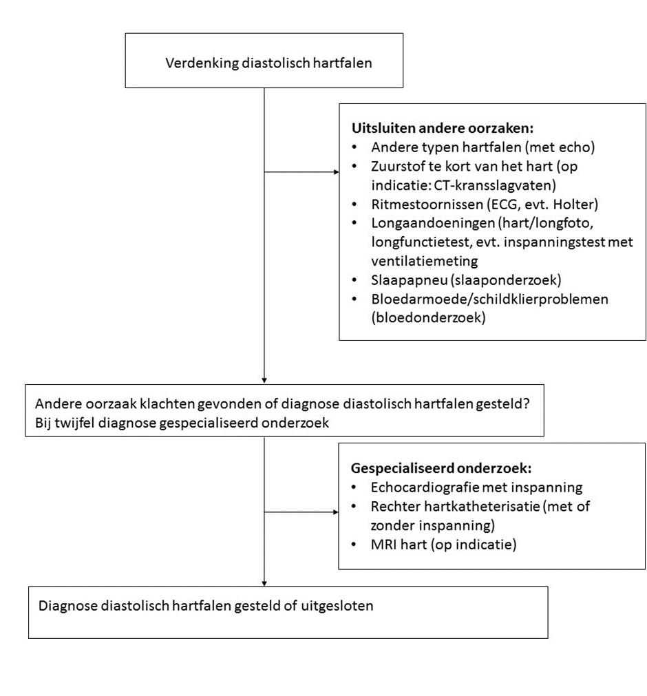 In het begin is het dus vaak onduidelijk of de klachten van het hart komen of van iets anders (bijvoorbeeld de longen). Daarnaast komen veel aandoeningen samen voor met diastolisch hartfalen. Daarom zal de arts in het begin soms zowel onderzoek in zetten van het hart, als van andere mogelijke oorzaken. De onderzoeken worden besproken onder “Stappenplan”.