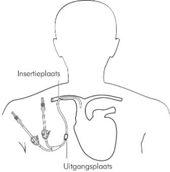 De katheter wordt door de arts onder de huid van de borst ingebracht, in een grote ader die naar het hart leidt. Dicht bij het sleutelbeen wordt een kleine snede gemaakt, de “insertieplaats” of ingangsplaats. Langs deze ¬snede wordt de katheter naar de grote ader gevoerd. Onder de huid wordt een tunnel gemaakt tussen de “ingangsplaats” naar een andere snede, waar de katheter naar buiten komt, de “uitgangsplaats.” Het uiteinde dat buiten het lichaam blijft wordt dan door de tunnel van de ingangsplaats naar de uitgangsplaats getrokken.