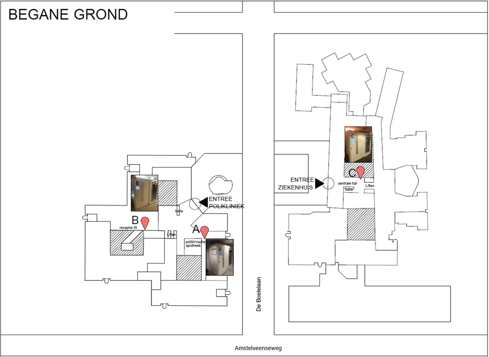1. Medicijnkluis A: Deze staat bij de apotheek in de polikliniek. U vindt de kluis in de gang links van de balie van de apotheek.