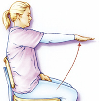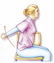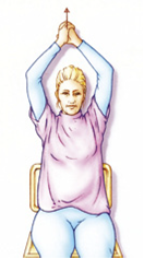 Pak uw handen achter uw rug samen vast en beweeg ze gestrekt omhoog. Blijf goed rechtop zitten.