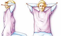 Uw handen achter uw oren tegen uw achterhoofd leggen en vervolgens uw vingers ineen strengelen. Houd uw ellebogen eerst ontspannen naar voren en breng ze daarna zo ver mogelijk naar achteren