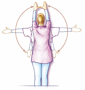 Vouw uw handen in elkaar. Daardoor wordt uw arm aan de geopereerde kant gesteund. Uw armen zo ver mogelijk gestrekt omhoog brengen.