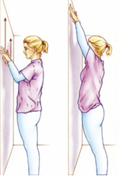 Sta met uw rug tegen de muur en breng beide armen zijwaarts omhoog, zo hoog u kunt. Uw handen blijven contact houden met de muur. De eerste week na de operatie met een okselkliertoilet of wanneer u nog een wonddrain heeft, gaat u niet verder dan 90 graden (zie tekening).