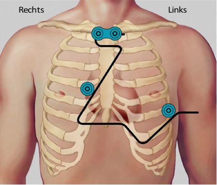 Net als een standaard ECG, registreert de Event recorder elektrische signalen van het hart via een aantal elektroden die op de borst geplakt worden. Het aantal en de positie van de elektroden hangt af van het model. Het model dat wij op locatie AMC gebruiken heeft vier elektrodes. Op onderstaand plaatje kunt u zien hoe de elektrodes op uw borstkas geplakt worden.