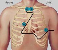 Net als een standaard ECG, registreert de Holter recorder elektrische signalen van het hart, maar dan voor 24 of 48 uur. Er worden hiervoor vier elektroden op uw borst geplakt, een schematisch voorbeeld van de elektroden en hun positie is weergegeven in het figuur hier onder. Deze elektroden zijn verbonden met een klein plastic kastje, dit is de recorder. De recorder zult u de hele dag bij u dragen in een schoudertasje.