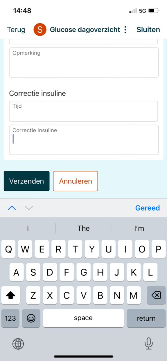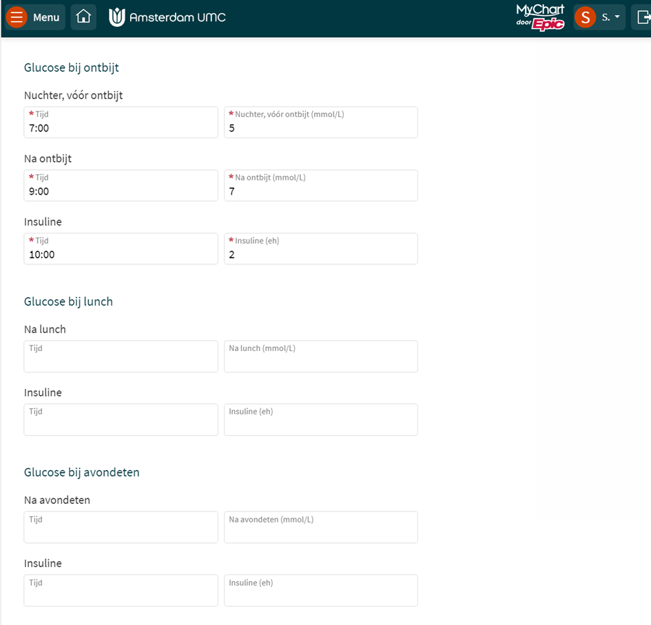 - Vul de glucosewaarden, insulinewaarden en eventuele opmerkingen in.