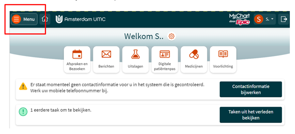 Klik linksboven in Mijn Dossier op ‘Menu’.