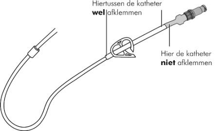 Nooit de dop afnemen zonder de katheter af te klemmen. U dient steeds een klem bij u te hebben.