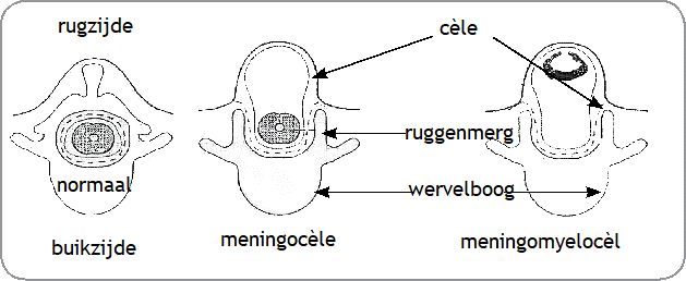 Gaat een meningocèle gepaard met een afwijkend ruggenmerg, (myelodysplasie) dan spreken we van (mmc). Dan zijn wel neurologische problemen te verwachten.