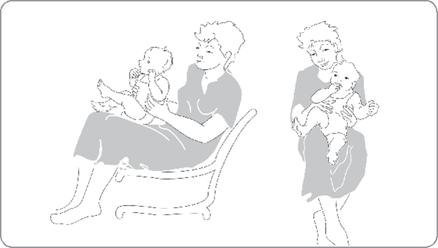 In de eerste maanden kunt u een gewone kinderwagen, buggy of auto-stoeltje gebruiken. Het is wel belangrijk dat u uw kind regelmatig op schoot neemt, omdat u zittend op schoot spelenderwijs balansreacties kunt stimuleren (zie afbeelding 5 en 6). Deze zijn later weer belangrijk voor het leren omrollen, tijgeren of kruipen.