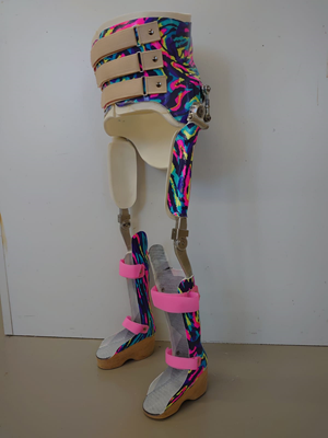 Soms is het te overwegen om te starten met lange beenbeugels (zie foto 3). Later kan het gebruik van lange beenbeugels meestal afgebouwd worden naar onderbeenvoetkokers, spalkjes rond de onderbenen of orthopedische schoenen. In het begin zal uw kind misschien een rollator nodig hebben. Later, ongeveer vanaf de leeftijd van vier jaar, kunnen krukken gebruikt worden als uw kind goede arm- en handfunctie heeft.