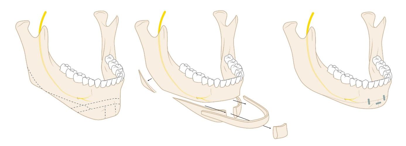 De operatie wordt verricht via de mond. De kin wordt losgezaagd van de onderkaak, waarbij een verticaal deel en eventueel ook een horizontaal deel wordt verwijderd. Daarna wordt de kin in de gewenste positie vastgezet met titanium plaatjes en schroeven (figuur 5). Vervolgens wordt de onderkaak verder gemodelleerd door middel van zagen en schaven. De plaatjes en schroeven blijven altijd zitten, tenzij ze klachten veroorzaken (irritatie of een ontsteking).