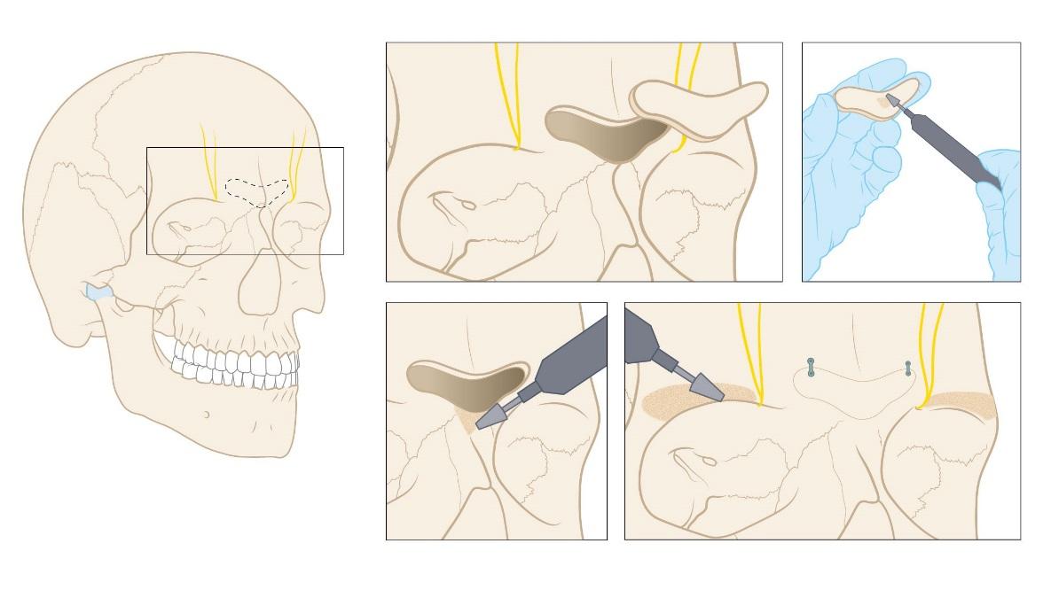 Vervolgens wordt het bot van het voorhoofd gecorrigeerd door de voorwand van de voorhoofdsholte met een klein boortje los te maken, glad te polijsten, en vervolgens meer naar binnen terug te plaatsen en te bevestigen met titanium plaatjes en schroeven (figuur 3). De plaatjes en schroeven blijven altijd zitten, tenzij ze irritatie veroorzaken.