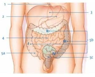 Figuur 1: (1) slokdarm (2) maag (3) lever (4) dunne darm (5) dikke darm (a) blindedarm (b) colon: I opstijgend deel II dwarslopend deel III dalend deel IV sigmoïd (5c) endeldarm © 2013 KWF Kankerbestrijding(1) slokdarm (2) maag (3) lever (4) dunne darm (5) dikke darm (a) blindedarm (b) colon: I opstijgend deel II dwarslopend deel III dalend deel IV sigmoïd (5c) endeldarm © 2013 KWF Kankerbestrijding