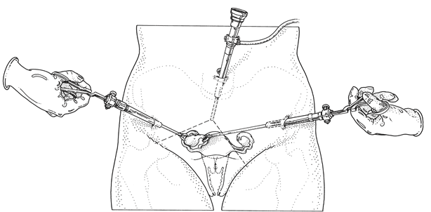 بعد ذلك، يتم فصل المبيضين وقناتي فالوب عن الرحم وجدار الحوض. بعد أن يتم فصلها، يتم وضع المبيضين وقناتي فالوب في كيس صغير يتم إخراجه من خلال جدار البطن، من خلال نفس الشق الذي دخلت فيه الأدوات.