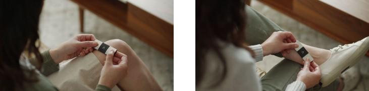 Met deze methode maakt u een ritmestrook door uw duimen op de twee grijze plaatjes te houden. Houd de achterkant van de Kardia op uw linker bovenbeen of linkerenkel. U drukt met uw duimen rustig het plaatje tegen de enkel of been aan zodat de Kardia goed contact krijgt met de huid. De Kardia start vervolgens met opnemen.
