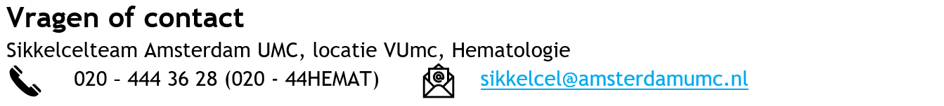 - Als u koorts heeft, ziek bent of verkouden, bel dan altijd eerst het sikkelcelteam. Soms wordt de behandeling dan uitgesteld om risico’s te voorkomen.