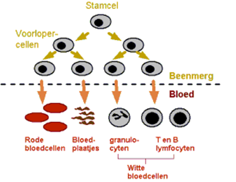 Hieronder ziet u een schema van de bloedvorming; van stamcel tot volwassen cel.