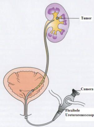 Als er een verdenking bestaat op een hoge urinewegtumor wordt dit vaak op een CT-scan gezien. Om de verdenking te bevestigen door middel van weefselonderzoek (een biopsie) volgt een kijkonderzoek in de urineleider en nier, dit noemen wij een ureterorenoscopie, afgekort URS (zie figuur 1). Dit onderzoek wordt gedaan onder een algehele verdoving (narcose). Tijdens dit onderzoek kan de uroloog zien of er sprake is van een hoge urinewegtumor, waar de tumor zit en kan er weefsel worden afgenomen voor onderzoek. Dit weefsel wordt verstuurd naar de patholoog voor verder onderzoek.