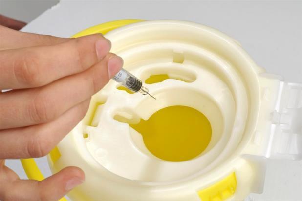- De injectiespuit met naald doet u in de naaldenemmer. Een volle emmer klikt u dicht en levert u in bij uw apotheek.