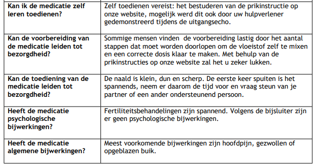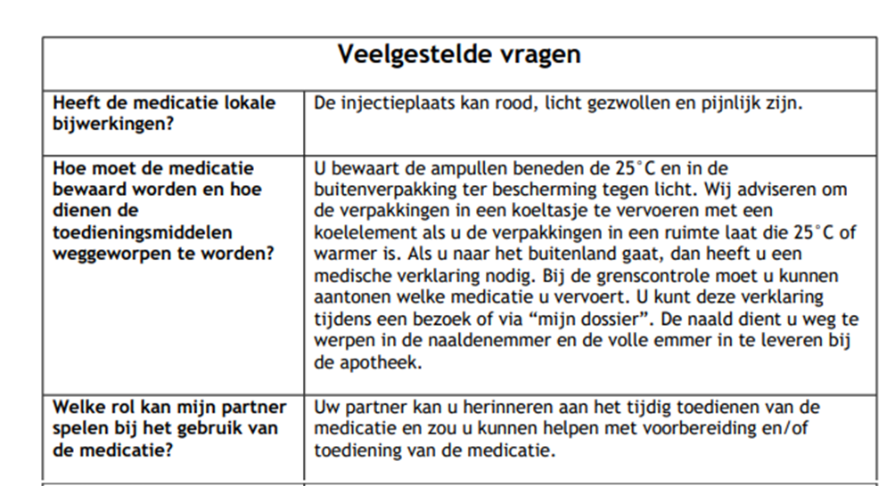 Wij werken samen met u en de poliklinische apotheek om verspilling van medicatie tegen te gaan. Hou daarom goed bij hoeveel injecties u nog thuis heeft zodat wij een recept op maat voor u maken. Overgebleven medicatie kan nooit aan andere patiënten worden verstrekt. Wij vragen u om overgebleven medicatie zo lang mogelijk te bewaren; ook als u net zwanger bent. Pas als uw medicatie “over de datum” oftewel verlopen is, lever deze dan ter vernietiging in bij een apotheek. Gooi medicatie nooit bij uw huisvuil.