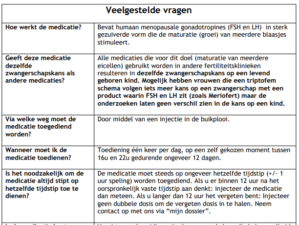 Belangrijk: wij raden u aan om uw voorraad injecties nauwgezet te controleren. De afdelingen Voortplantingsgeneeskunde hebben geen injecties op voorraad, ook de spoedeisende hulp vrouwenziekten (SEHV locatie AMC) heeft deze injecties niet. Als u meer injecties nodig heeft, neem dan direct bij voorkeur per mijn dossier contact met ons op. Doe dit op tijd want het is belangrijk dat u zichzelf elke dag rond het zelfde tijdstip prikt; in ieder geval tussen 16.00 en 22.00 uur. Heeft u direct een injectie nodig buiten onze kantooruren, neem dan contact op met de dienstdoende gynaecoloog van het AMC (via de Spoedeisende Hulp Vrouwenziekten, SEHV, tel. 020-5661500). Deze kan een noodrecept verstreken maar alleen binnen de openingstijden van de Poliklinische Apotheek AMC.