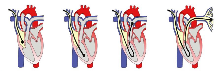 Via de rechterhartboezem en rechterhartkamer kan met de katheter de longslagader worden bereikt.