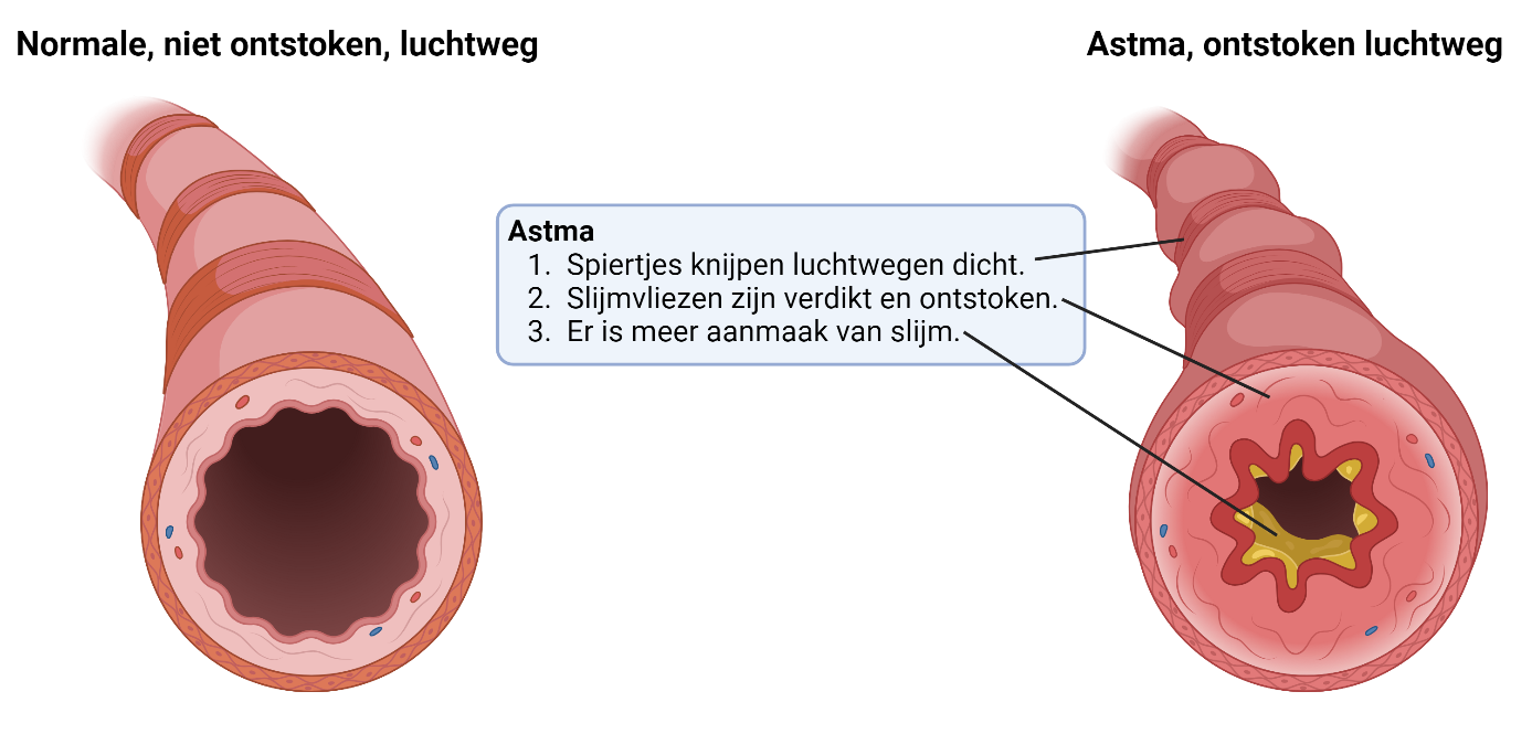 Astma is een ziekte van de longen waarbij de luchtwegen ontstoken zijn. Hierdoor zijn slijmvliezen verdikt, wordt meer slijm aangemaakt en zijn de spiertjes rondom de luchtwegen samengeknepen. In de afbeelding hieronder ziet u dat als luchtwegen ontstoken zijn deze vernauwd raken. Lucht met zuurstof kan hierdoor moeilijker in en uit de longen. Kinderen kunnen dan last hebben van hoesten, piepende ademhaling, drukkend gevoel op de borst en een benauwd gevoel. Dagelijkse activiteiten zoals sporten en slaap kunnen hierdoor moeilijker zijn.