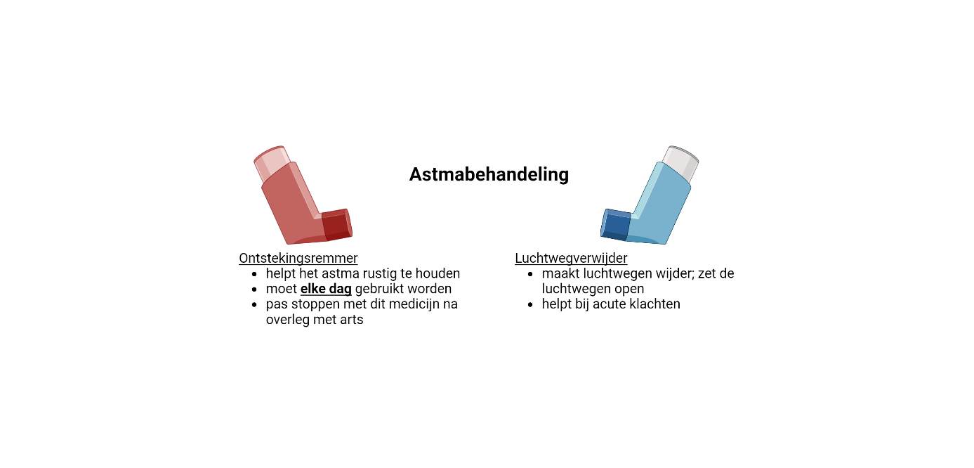 Astma is een ziekte waarbij de luchtwegen ontstoken zijn. Daarom bestaat de behandeling meestal uit ontstekingsremmers. Dit zijn medicijnen die de ontsteking in de luchtwegen verminderen. Ze worden meestal via een inhalator (pufje) ingeademd, zodat ze direct in de longen terechtkomen.
