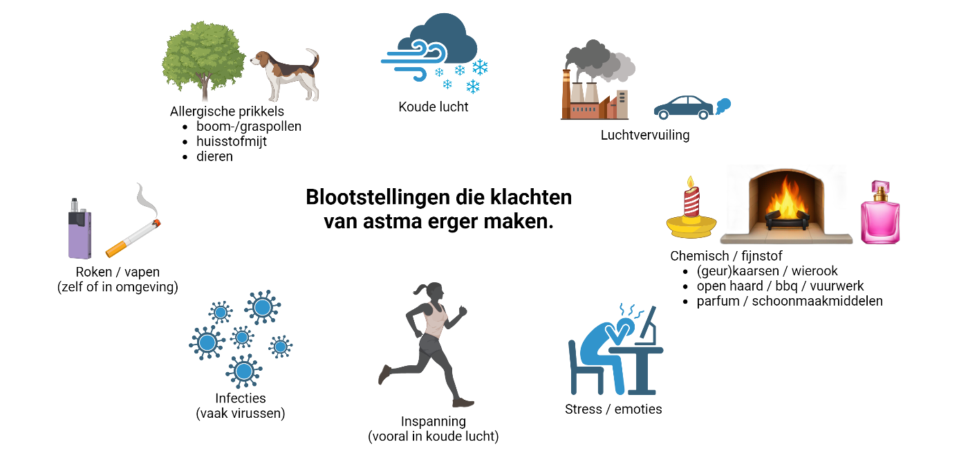 Bij astma zijn de luchtwegen extra gevoelig. Daardoor kunnen ze snel gaan ontsteken. Verschillende prikkels kunnen die ontsteking en daarmee ook astmaklachten verergeren.