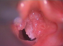 Figuur 2: larynxpapillomatosis op stembanden en in het strottenhoofd
