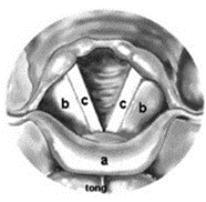 Figuur 4: a: strotklepje, b: valse stembanden, c: ware stembanden