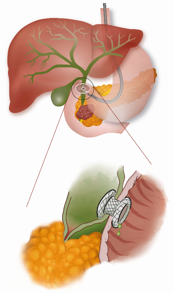 EUS-CDS is een nieuwe techniek die is ontwikkeld om de procedure makkelijker te maken. De endoscoop wordt minder diep in de dunne darm geplaatst waarna de galweg wordt opgezocht met een echo-apparaatje wat op de endoscoop zit. Vervolgens wordt er een gaatje gebrand in de wand van de dunne darm en de galweg, waarna een stent kan worden geplaatst. Zodoende is er een nieuwe verbinding gemaakt tussen de galweg en de dunne darm waardoor de gal kan afvloeien (figuur 2).