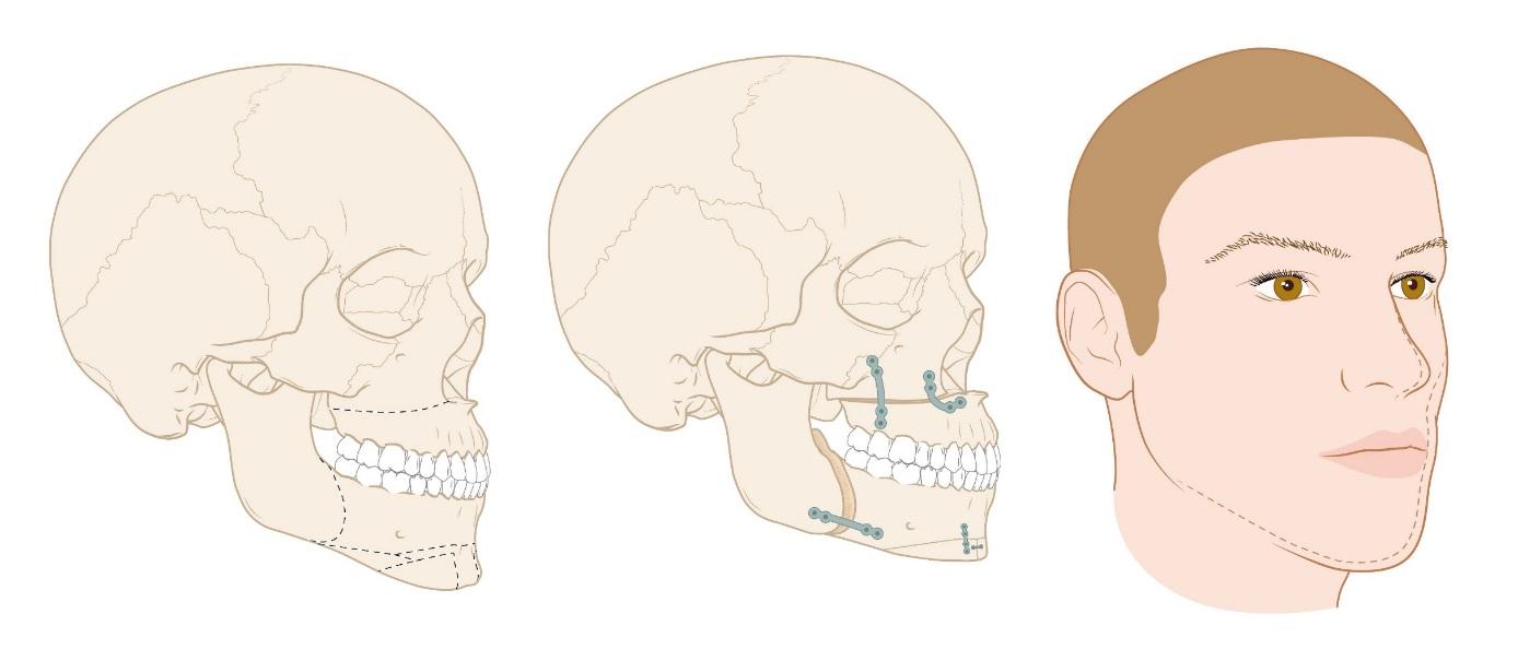 Een vooruitstekende onderkaak wordt beschouwd als een mannelijk gelaatskenmerk. Dat kan worden gecorrigeerd door de kaak los te zagen en naar achteren te verplaatsen, de bovenkaak los te zagen en naar voren te verplaatsen, waarna de boven- en onderkaak in de gewenste positie worden geplaatst. Hierdoor krijgt het gezicht een diamantvormig, vrouwelijk uiterlijk. De boven- en onderkaak worden vastgezet met titanium plaatjes en schroeven (figuur 8).
