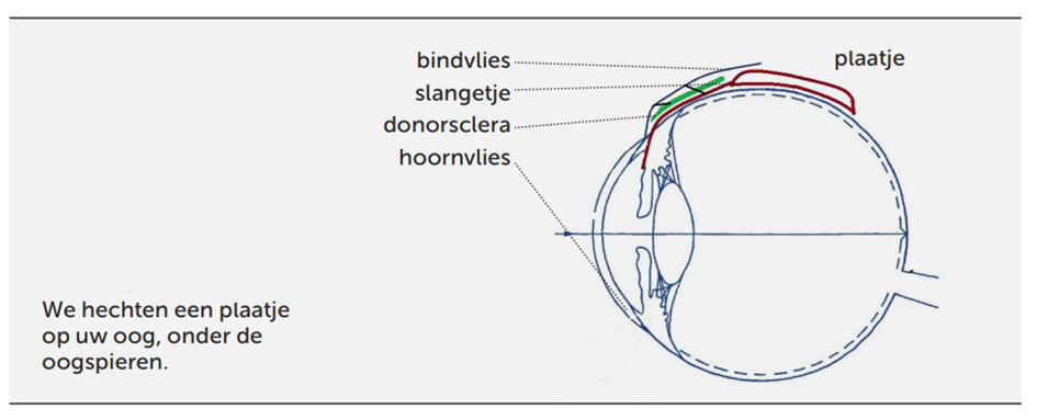 Het slangetje moet goed bedekt en beschermd blijven, daarom dekken we het af met donormateriaal. Meestal gebruiken we hiervoor een klein stukje van een menselijk donoroog (donorsclera). Afstotingsreacties van het donorsclera stukje komen nooit voor.