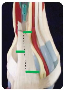 Figuur 2: Achillespees verlenging. We kijken naar de achterzijde van de enkel/hiel. De 3 groene streepjes zijn de scheurtjes in de Achillespees.