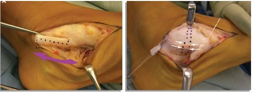 Figuur 3: Op het linker plaatje zien we de tibialis posterior pees. Het getekende stippellijntje heeft de vorm van een Z. Met deze techniek (Z-plastiek) kan de pees worden ingekort. Het rechter plaatje laat het kapsel zien. Hier wordt een reepje (tussen de stippellijnen) verwijderd en weer (strakker) gehecht.