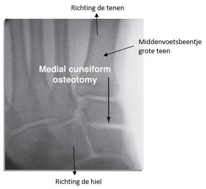 Figuur 5: Medial cuneiform osteotomy. Deze pijl wijst naar de plaats waar het botje wordt doorgezaagd. Er wordt een wigvormig stukje donorbot in geplaatst waardoor de grote teen wat omlaag wordt gedrukt.