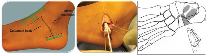 Figuur 1: Voorbeeld van een calcaneus verlenging. Op het linker plaatje zien we het litteken (zwarte streep). Superficial peroneal nerve = oppervlakkige huidzenuw. Lateral malleolus = buitenknok. Sural nerve = oppervlakkige huidzenuw. Calcaneal beak=voorste punt van het hielbot. Op het middelste plaatje zien het donorbot wat in het hielbot wordt geplaatst. Het rechter plaatje geeft een schematische weergave.