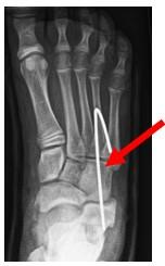 Figuur 4: Röntgenfoto van de voet waarbij we zien dat de K draad (De witte lijn aan het einde vd pijl) in het CC gewrichtje is geplaatst.