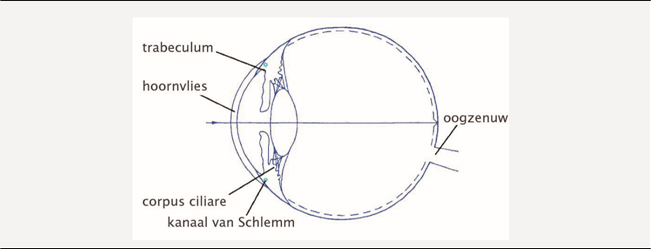 Figuur I: Bouw van het oog. Kamerwater wordt aangemaakt in het corpus ciliare. Dit water verlaat het oog weer via het trabeculum en het kanaal van Schlemm. Bij aangeboren glaucoom is het trabecullum verstopt waardoor het kamerwater het kanaal van Schlemm niet kan bereiken. Door de hoge druk wordt het hoornvlies troebel en wordt op den duur ook de oogzenuw beschadigd.