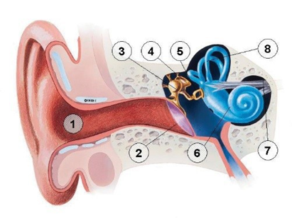 Figuur 1. Het oor bestaat uit een aantal onderdelen (zie figuur), te beginnen met de oorschelp en de uitwendige gehoorgang (1), het trommelvlies (2) en daarachter het middenoor. In het middenoor bevinden zich drie gehoorbeentjes: hamer (3), aambeeld (4) en stijgbeugel (5). Het eigenlijke gehoororgaan is het binnenoor (6), ook wel slakkenhuis genoemd. Daarachter zit de gehoorzenuw (7). Het evenwichtsorgaan (8) is verbonden met het slakkenhuis (6).