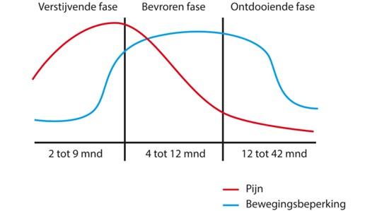 • Fase 1 is de ‘verstijvende’ fase, die zes weken tot maximaal negen maanden kan duren. De pijn neemt geleidelijk toe en tegelijkertijd neemt de beweeglijkheid af.