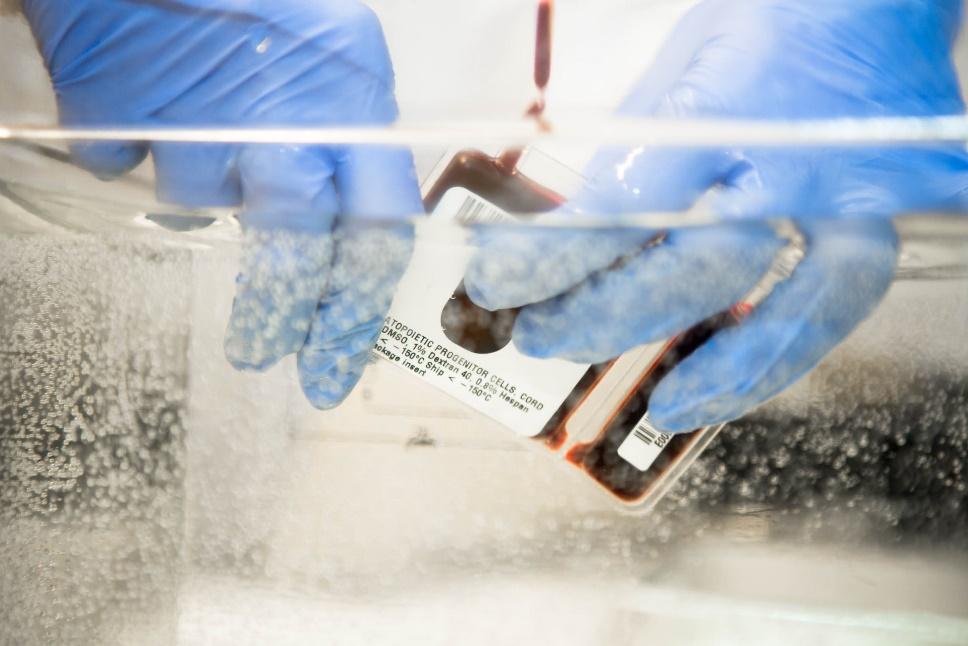 De stamcellen die met behulp van een leukafereseapparaat zijn afgenomen, worden vlak voor teruggave op de afdeling ontdooid.
