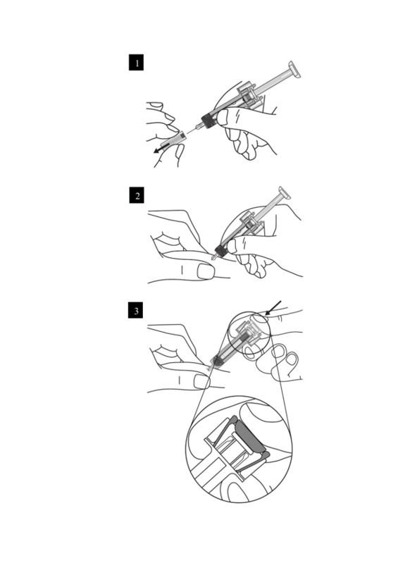 5. Laat de zuiger langzaam los en laat de veiligheidsbescherming van de naald automatisch de blootliggende naald bedekken.