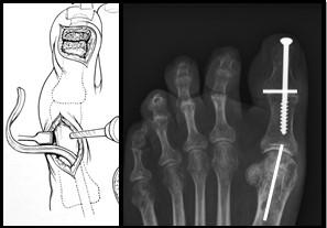 Figuur 5: Op het linker plaatje is de grote teen zichtbaar. Er worden 2 littekens gemaakt. De pees wordt losgehaald bij het eindkootje en door het middenvoetsbeentje gevlochten door een boorgat. Op de rechter foto is de schroef zichtbaar die beide kootjes aan elkaar verbindt. Deze wordt vanuit het puntje van de teen geboord middels een (klein) 3e litteken. De witte streepjes geven de locatie van de andere 2 littekens aan.