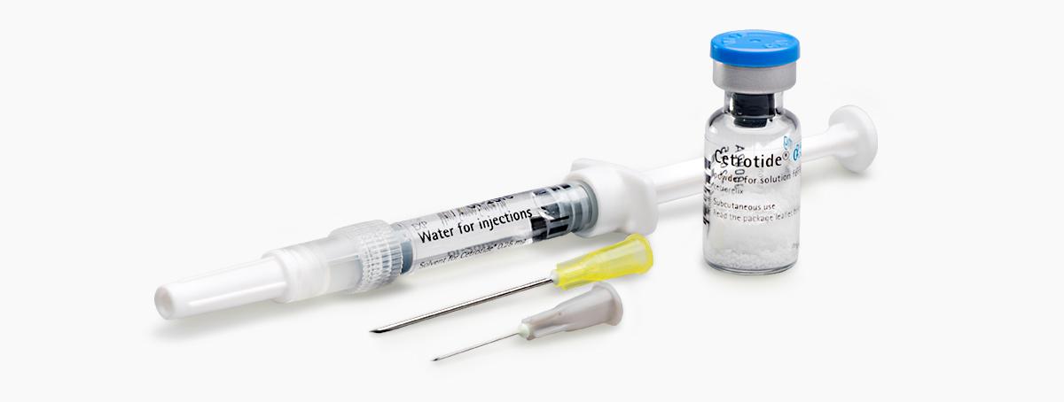 Een injectie Cetrotide® maakt u zelf klaar, waarna u het middel inspuit in de buikplooi. Eén verpakking bevat een ampul met een bolletje 25 mg Cetrotide® poeder, een spuit met 1 milliliter (ml) oplosvloeistof en 2 naalden. Deze folder beschrijft de prikinstructie voor een injectie met Cetrotide®.