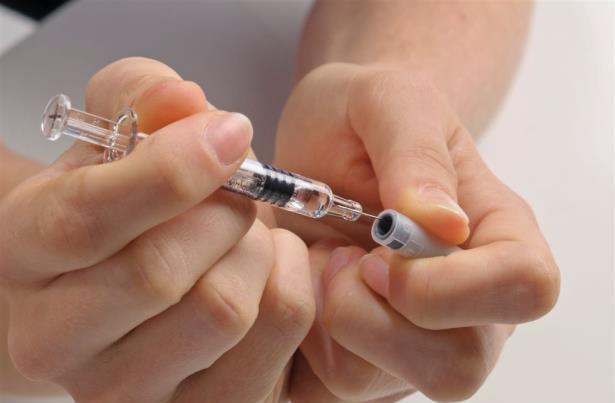 - Neem de spuit en prik snel, loodrecht in de huid. Zorg ervoor dat de hele naald in de huid zit. Druk de spuit in drie à vijf seconden helemaal leeg. Trek daarna de naald snel weer uit de huid.