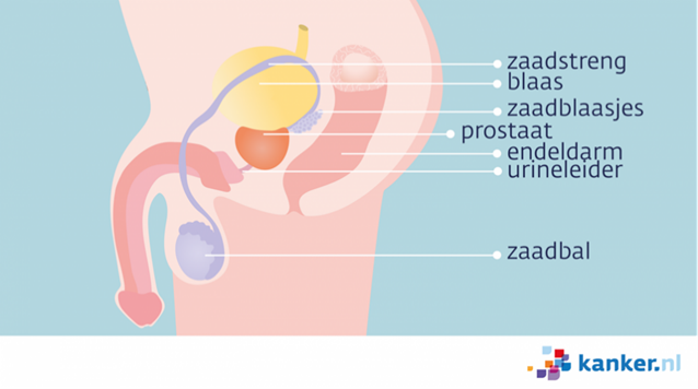 De prostaat is onderdeel van de mannelijke geslachtsorganen. De prostaat ligt onder de blaas en net voor de endeldarm, het laatste stuk van de dikke darm. De plasbuis (urineleider) loopt door de prostaat heen. De zaadblaasjes zitten aan de bovenkant vast aan de prostaat.