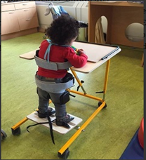 Door het belasten en strekken van de benen tijdens het staan, ontstaan er minder snel buigingscontracturen in heupen en knieën. Een statafel kan aangemeten worden om uw kind met steun rechtop te zetten en te staan (zie foto 1) Uw kind kan dan spelen aan een tafeltje en ongeveer een half uur tot een uur per dag staan. Het kind kan zich hiermee ook leren voortbewegen.